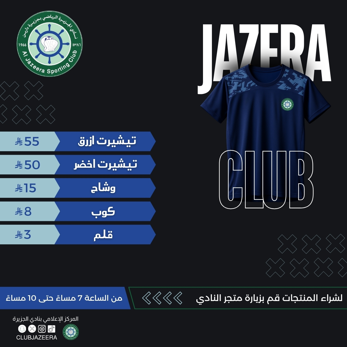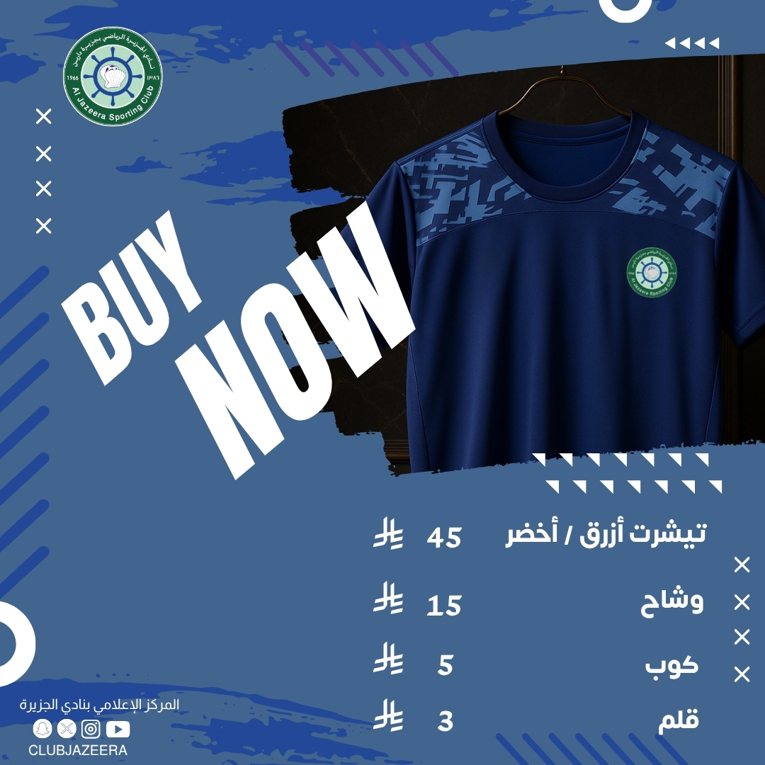 عشاق نادي الجزيرة، هذا وقتكم! احصلوا على خصومات حصرية لا تُفوّت فقط لمحبي النادي! زورونا اليوم من الساعة 7 مساءً حتى 10 مساءً واستمتعوا بتجربة لا تُنسى في قلب النادي!